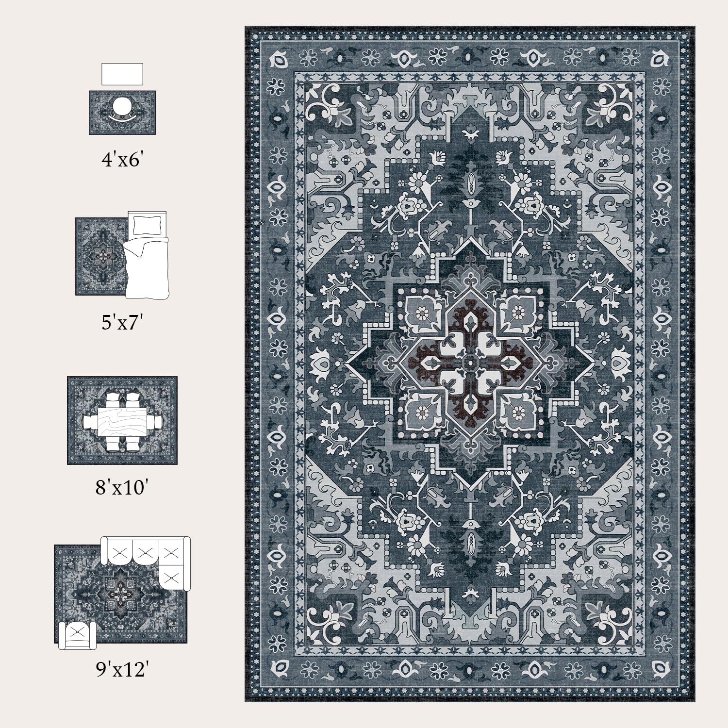 - Versatile Use: Comes in a range of stylish colors and sizes to suit any room. Its intricate patterns and dark tones help conceal stains, making it ideal for placement in front of sofas, under dining tables, or beside the bed.